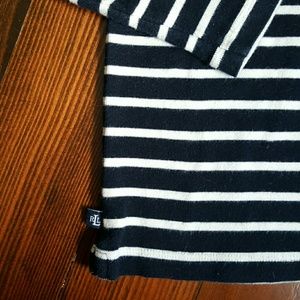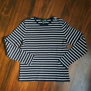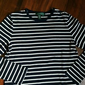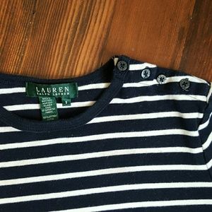 •Lauren Ralph Lauren top in deep navy blue and white stripes. With 3/4 sleeves and four buttons on the left shoulder. Lightly cropped. In great used conditon.