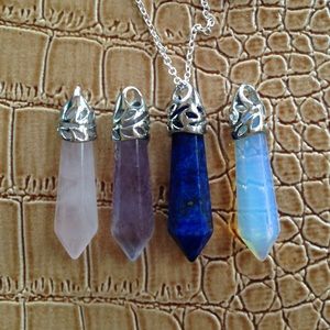 Rose Quartz, amethyst, Opalite, and lapis stone pendants on an 18" OR 24"sterling silver chain necklace with lobster clamp. Price is for one. Excellent quality and stunning stones! *AMETHYST AND ROSE QUARTZ ARE NO LONGER AVAILABLE*
