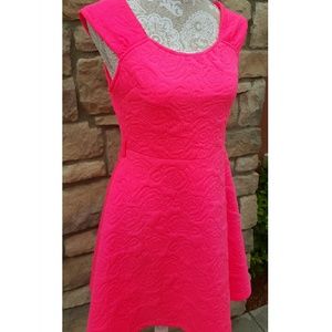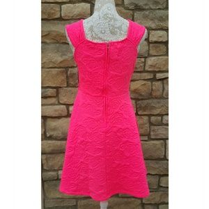 The tag States 90% polyester 10% spandex. The material is soft and stretching. The floral design is stitched onto the dress, which looks very pretty. The dress is very lightweight, and also wrinkle-free. :)