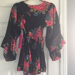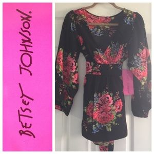 Betsey Johnson long sleeves v neck tie back too, size medium. Iconic pink floral on black. 100% polyester. New with tag attached.