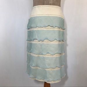 This skirt is so fun and flirty and can fit the work, party, casual, and date night scene! Feminine baby blue 100% silk ruffles cascade in rows down a cream colored soft suede like skirt with tiny punch holes. Fully lined with side zipper. Shell is 80% polyester 20% polyurethane. Lining is 100% acetate dryclean. Approx flat meas: length 23.5", waist 15", hips 19.5", hem 23". EUC has a small snag on 2nd ruffle in back (see pics)