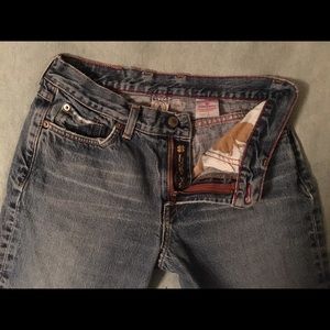 These are a comfy pair of Lucky Brand Bootcut Dungarees in a size 8. Bottoms are frayed and Lucky Brand label is ripped on the back. Inseam measures 35". Style # 82063D4