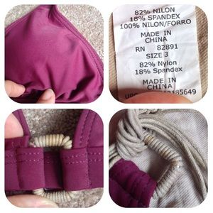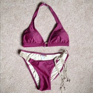 Gorgeous ST TROPEZ maroon bikini! Halter top with rope detail and hook closure at top and back. Bottoms have a macramé rope design at sides and beads on tie! Last pic shows a few minor flaws! Worn once! Clearing out!! Thanks for looking!!