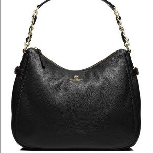 Shoulder hobo bag in pebbled leather kate spade new york gold printed signature with tiny cutout spade 14-karat light gold plated hardware Chain link & leather shoulder strap. Top zip closure. Lined. Interior zip, wall and slip pockets. 11.5"h x 13.5"w x 4.3"d 8" Drop