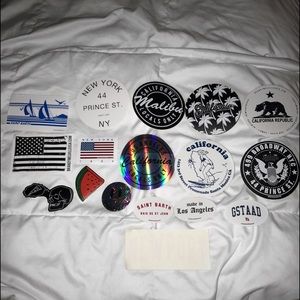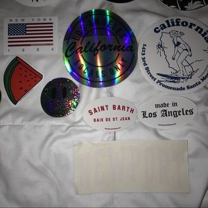 @furahnces can I buy the good vibes sticker, the silver shiny smiley, white LA 1984, Malibu Cove circle, California Republic circle