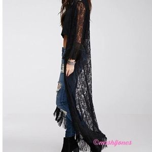 5-⭐️Rated and best seller! Gorgeous long maxi-length lace fringe kimono in black. Very silky and stretchy. Such a versatile piece! Currently available in M and L. Brand new without tags. Boutique. Measurements: S: shoulder to shoulder 14", sleeve 24.4", length 55"; M: s to s 15", sleeve 25.2", length 56.6"; L: s to s 15.8", sleeve 26", length 56.6". ❌ NO TRADES ❌ NO LOWBALLING ❌