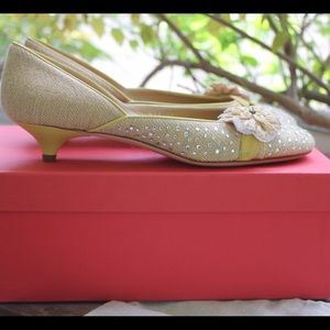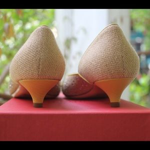 These never worn before Valentino kitten heels are perfect for summer outings or events with their burlap/like exterior, warm yellow leather accents, straw and tulle flower, and spray of sparkles. Wear them with jeans to the farmers market or pair with a brightly colored summer dress.