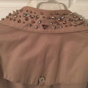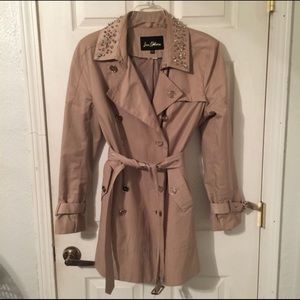 NWOT, GORGEOUS, great quality classic khaki colored trench jacket, but with a modern twist! Gold spikes & varying rhinestone studded collar, gold buttons/belt/accents & logo on back collar. Sleeves & waist have adjustable belts with buckles. Leopard lining, front pockets, bought it but have too many jackets & have never worn it sadly. Needs someone to show it the love it deserves! Fits TTS, but can be tied tighter. If you need measurements or have ?’s just lmk. Sz XL, **PRICE IS FIRM** thanks!