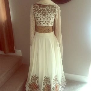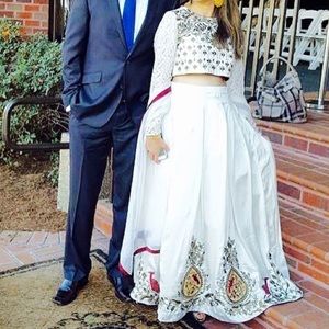 Poofy skirt with cancan with crop top. Fits a small size. Only worn once to a wedding . Top has lace sleeves and zipper in the back. Pen mark on skirt can show in pic but not noticeable when skirt is worn. Skirt border is embroidered and top is embroidered too. This was made on special order for me and the top is slightly tight which is why I have to give it away. I wear a bra 34C, it fit OK as u can see but felt snug.