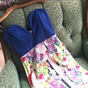 This lovely floral & stripe dress, has a deep sexy heart shape bust line. For structure There is wiring & light padding. has a back split., approx 35.4" long & a poly/spandex blend NWOT