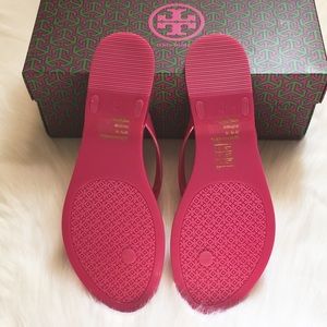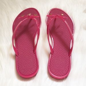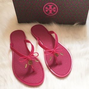 NEW Tory Burch Jelly Bow Thong Sandals. Size: 9. Color: Pink. Comes in original box. Durable and waterproof, with a unique diamond pattern on the footbed. Topped off with a tiny logo charm, it’s a practical style that can go almost anywhere, from city to seaside, gym or spa.