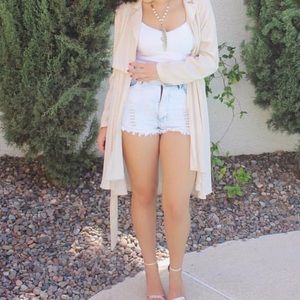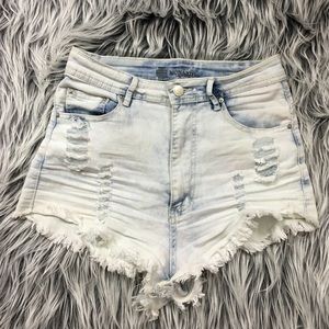 Light Wash High Waisted Shorts with a 5 pocket design, a zip front, single button closure, belt loops, rayed hems and a well-loved fade.