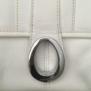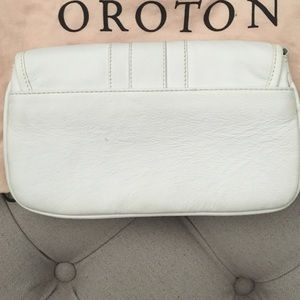 Designer white leather clutch with silver buckle. Oroton is a luxury handbag label in Australia. Used once. No scratches on hardware and dust bag included