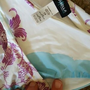 EUC. Worn only a few times; I'm just changing up my swimsuit collection! I see only two small flaws that were there when I purchased this new. One tiny what looks like an ink line on left side of bottom--hardly visible--and a couple tiny spots of the crystal glue that splattered on the left top triangle when they put the crystals on. Gorgeous suit with a few crystal accents and a butterfly print. Please note the top is a SMALL (best for A cups) and the bottom is a LARGE.