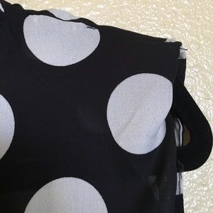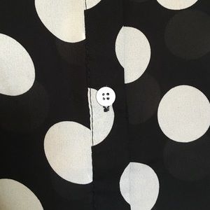 Sheer black button down with large white polka dots and small shoulder pads. Comfortable to wear in the summer with shorts or a skirt or in the winter with a cardigan and slacks. Size M.