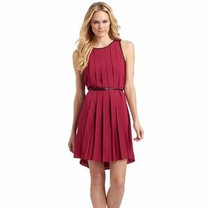 Does not have belt. Color: fuchsia or magneta. EUC. Silk pleated dress. Real leather trim neckline.
