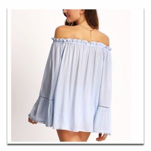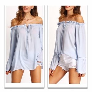Light baby blue, off the shoulder bell sleeve blouse. Perfect for a festival or wear to a company picnic, this pretty blouse can be dressed up and dressed down! Romantic and lightweight, perfect for summer!