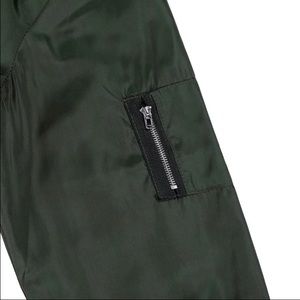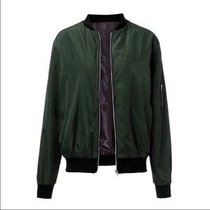 Light weight bomber jacket in olive. Perfect for layering and cool summer nights. Please see size chart before purchasing.