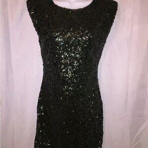 own the night in this miniature sequin crusted silk sheath!. light marks at under area, staining at interior lining at back of dress (see photo), not visible when worn)