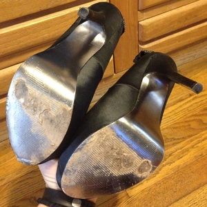 Steve Madsen has done it again with this glam and feminine pump. This will indulge your sweet tooth with its black satin upper and adorable rhinestone covered now. The silhouette of this style is simply stunning and boasts a 1 inches playlet and 5 inch heel. Only worn a handful of times.