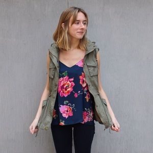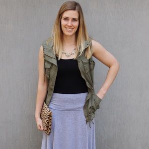 Olive green utility vest with pockets and detachable hood. Front of vest zips and snaps to close. This is a high quality best that is lined and has draw strings around the middle which can cinch to create varying sizes. Very versatile for all seasons! Only an XL is left but could be sized down to someone who usually wears a large as there is a middle string that can tighten on the waist area.