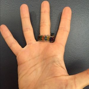 Beautifully vibrant rainbow of colors. Hand beaded without a pattern by a talented artist in Mexico City! Versatile! 1.25" W pattern and .3" W band. Has a little give to form to finger comfortably.