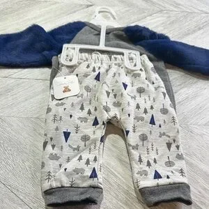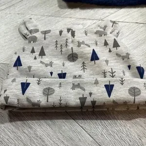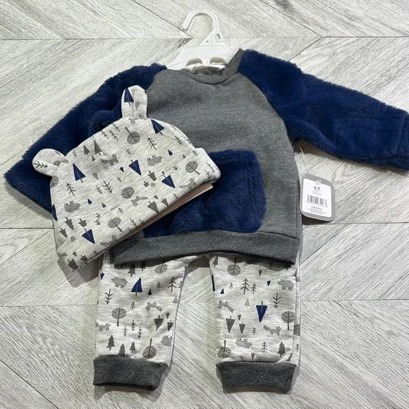 Cozy matching set with a gray top and navy sleeves. Includes a cute hat with ear details. Pants feature playful tree and triangle patterns.