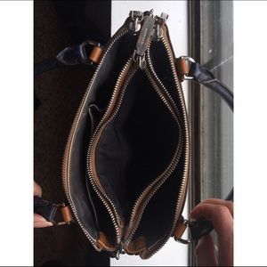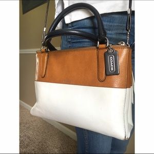 Color block Coach bag! Goes well with everything! 3 compartments and holds a ton for a small bag! It has been well used but still in great shape! The shoulder strap is missing some rubber lining but you can hardly tell.