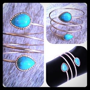 Never worn! Two pear cut turquoise gemstone open ended wrap bracelet. Bracelet diameter is 2.7". Gold plated brass.