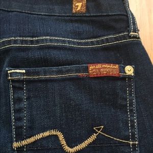 These jeans look brand new!! Only worn once and they are beautiful. Seven for all mankind dark denim Kimmie bootleg jeans.