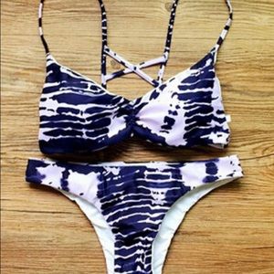 Brand new. Womans printed spaghetti strap bikini with cheeky bottoms. Size Large but fits like a Small. Measurements are 29.13 inches in the bust and waist.