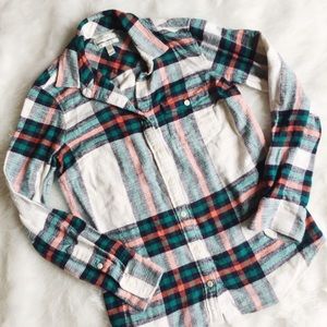 A classic J. Crew piece! The cozy, boy-fit plaid flannel in ROCK SALT PLAID. Retail. Size 2. Very difficult to find! Condition: Good pre-loved condition. Minor small discolored area on button placket, wouldn't show up in photographs because it's so difficult to see, even with the naked eye. Some pilling, but this is to be expected from this type of flannel.