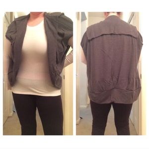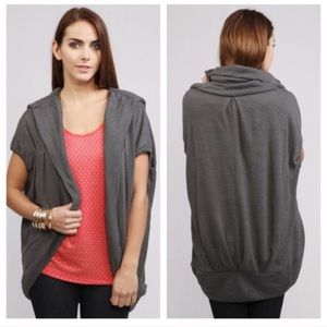 Gray oversized cocoon top. 80% acrylic/ 20% polyamide. Lightweight. Runs quite large- I am comfortably a 1x-2x and this fits me in a Large. *Please excuse the photos. I am definitely not a model 😃SAt1sAat7