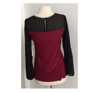 Materials- 100% rayon. The black part is sheer and the neckline is jeweled. Very stretchy top! Button closure on the backside. tAW1ft7