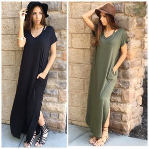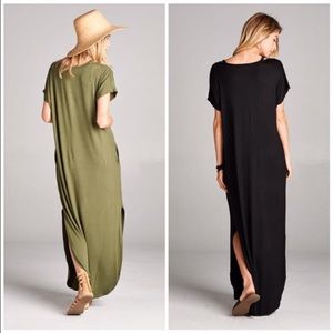 Popular trend this season. Casual comfy oversized maxi dresses with pockets. Embellished cut out strap detail. Color Olive and black. Made of rayon and spandex. Size S/M, M/L, L/XL black & white. S/M