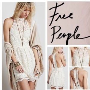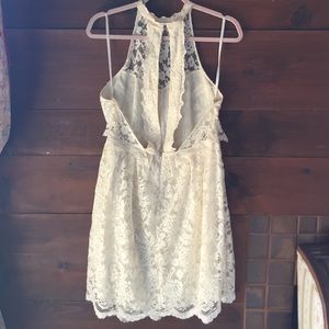 Size 4 - This dress is absolutely stunning on, suitable for a wedding shower or rehearsal dinner. It is an ivory lace with an ivory liner. The edges of the lace are scalloped. Open back that buttons around the top. Zipper on lower portion of the back. Pictures of model wearing the dress were found on Google Images to show how the dress fits.
