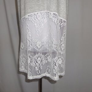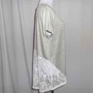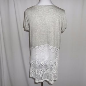 Beautiful loose style blouse that you can dress up or down. Solid gray front and most of the back. White sheer lace bottom of the back. Short sleeves. Rounded neckline. Hi-Lo. 96% Rayon 4% Spandex.