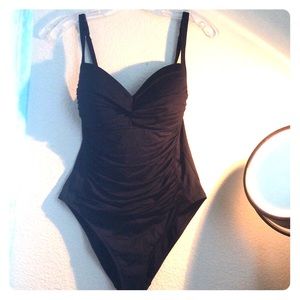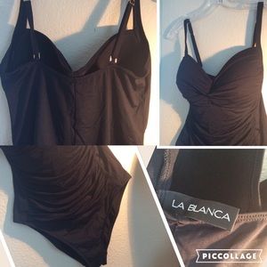 Island Goddess. A crisscrossed bust with a flattering sweetheart neckline sets the stage for this slimming one piece styled with figure flattering rouching and supportive foam cups. Beautiful swimwear gently used like new. La Blanca and La Blanca by Rod Beattie. Same suit two style numbers C-31013W1 and LB3AA17.