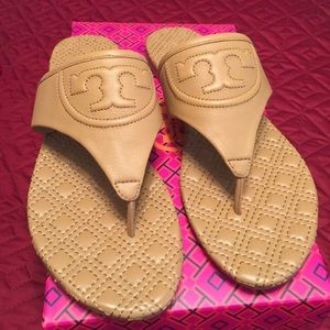 SOLD ON ANOTHER SITE 😃 Quilted Diamond leather foot bed is comfortable and cushioned. The top is detailed with top stitched T logo and is made out of soft supple leather. The Tory Burch color is called "Blonde". New, never worn and comes in original box.