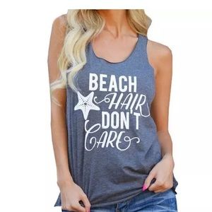 "Beach hair don't care" racerback tank top! Soft cotton blend, perfect for summer. Approx bust measurement underarm to underarm unstretched are S 15 1/2", M 16 1/2", L 18", XL 19".