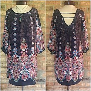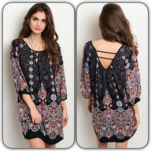 Calling all pretty women...here is a beautiful, flattering boho tunic dress you can wear with sandals or boots all year long. Can even be worn as a tunic. 100% wrinkle free polyester & lined. Gorgeous shades of blue & red pink against black background. ❤️❤️❤️❤️❤️❤️❤️
