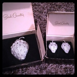 This is a vintage 1967 Sarah Coventry jewelry set! It is in pristine condition as it has been kept in the original boxes for years! The set includes a silver strawberry brooch and a pair of silver strawberry clip earrings. This would make a perfect gift! Make an offer :)