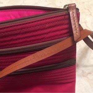 Red crossbody with 3 zipper feature for extra room, adjustable strap, very light use