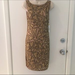 This is a NWT Alice + Olivia gold sequin dress in size 4. Retail MSRP $595. A form-fitting mesh dress is covered with sequined triangles for a modern styled finished with an exposed back zipper. Comes from a smoke-free, pet-free home. Offers are welcome through the offer button. No trades.