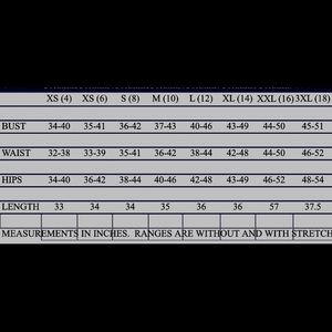 Measurements: Size S(6) measures 36" across bust, 35" waist, 38" hips, and is 33" long when laid flat and measured from top of shoulder to the bottom. Size L measures 38" across bust, 36"waist, 39" hips, and is 33.5 long when laid flat and measured from top of shoulder to the bottom. Size XL measures 39" across bust, 38.5" waist, 41" hips, and is 34" long when laid flat and measured from top of shoulder to the bottom.