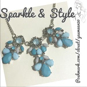 This beautiful necklace and earring set radiates with blue toned stones and gray crystals on an silver toned base and chain. Stunning!!
