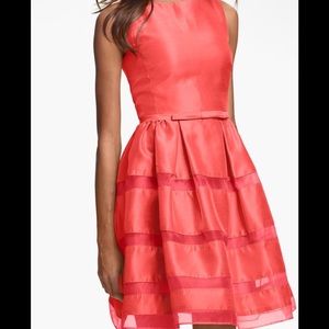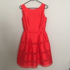Sheer organza stripes, buoyant skirt, and a V-back creates a sophisticated and adorable dress. Has never been worn. Dress is a size 4, but runs large. Fits like a size 6. 37" in length.