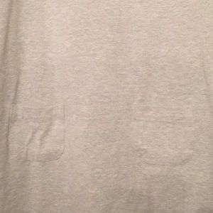 Hanes Gray T-shirt Dress with 2 front pockets, buttons on left shoulder, and 3/4 sleeves. Color is heather gray.