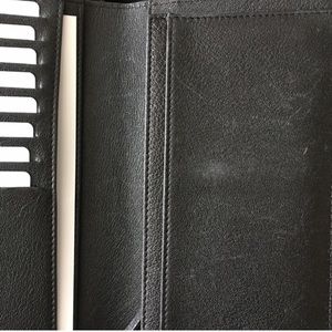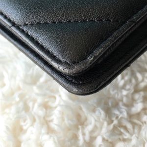 Authentic. Purchased in Paris last Fall (2016). Features 8 card slots, coin pocket & multiple bill slots. Soft delicate Lambskin leather. The black is a soft-black color. Signs of wear especially around the corners (has silvery sheen to it) scratches inside & slight rip at edge of 1st card slot as shown in photos! Comes w/ box, dustbag, authenticity/care cards. The Chanel logo is not scratched - is the original look of it (brushed/vintage). NO TRADES.