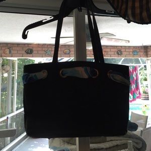 Cute Black Purse with blue bow, washable material, 11"x8-1/2"x3", 3 inside compartments, shoulder drop of 10" 1 compartment has a zipper, gently used, no stains or marks.